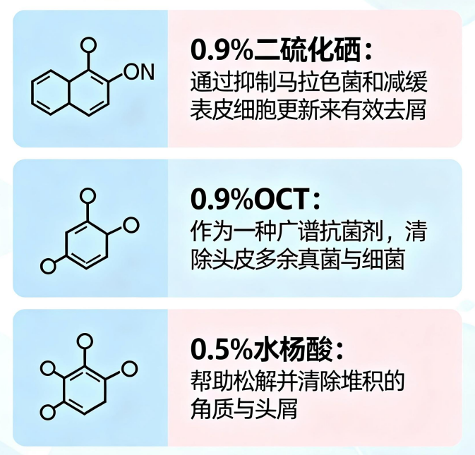 黛熙梦的配方逻辑非常清晰——它不是简单堆砌去屑成分,而是用 “0.9%二硫化硒 + 0.9%OCT + 0.5%水杨酸2.0” 组成了一支分工明确的“去屑特攻队”,从三个维度彻底改变头皮环境: