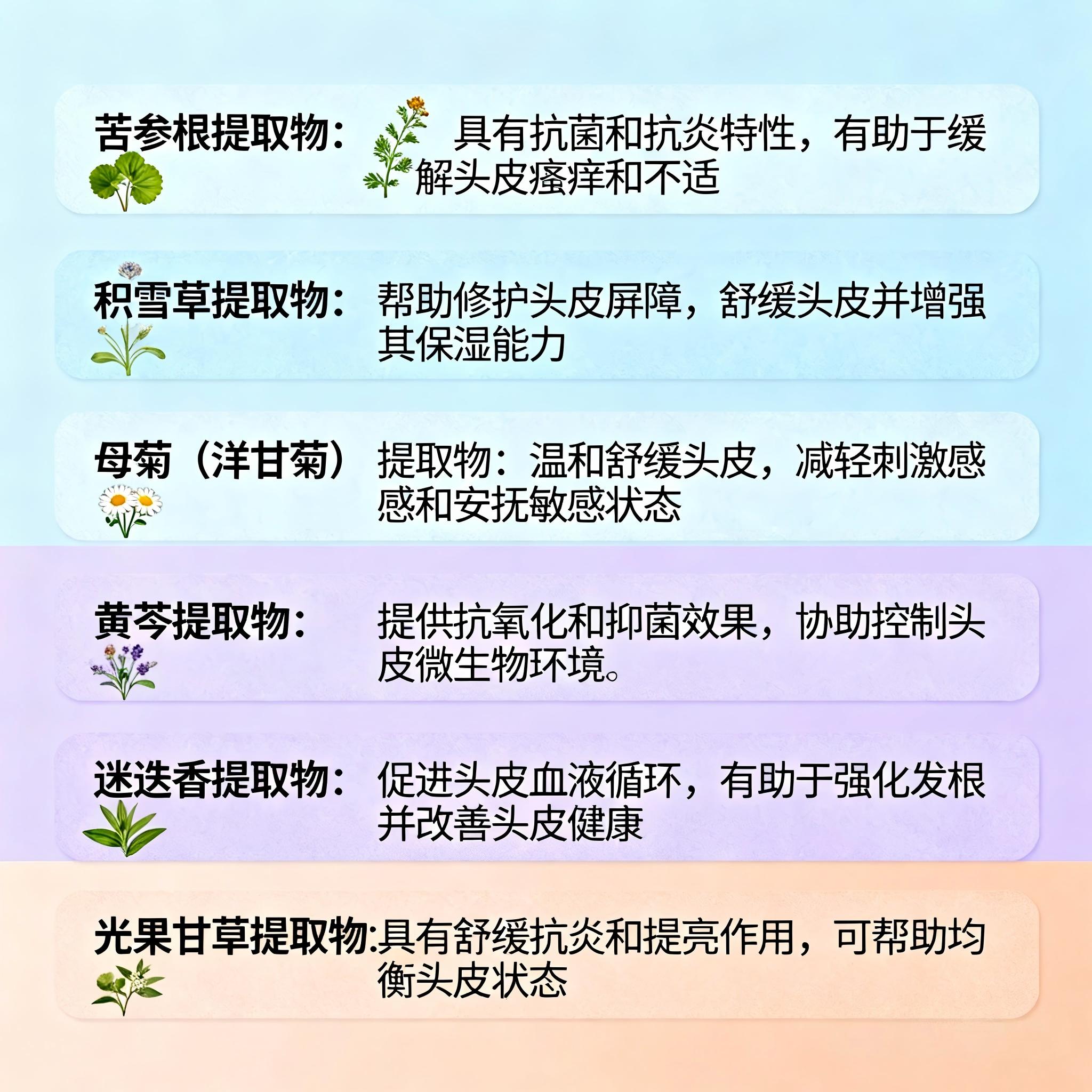 ·舒缓修复组:积雪草提取物、母菊提取物(洋甘菊)、虎耳草提取物,像给头皮敷了一层隐形的水膜,缓解头皮泛红、瘙痒。