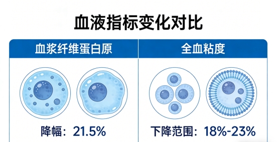 结果显示:测试组血浆纤维蛋白原降幅达21.5%,这意味着血栓形成的核心原料被有效控制;全血粘度下降18%-23%,血液粘稠度得到实质性缓解;超过82%的参与者自述头晕、胸闷等症状明显改善。