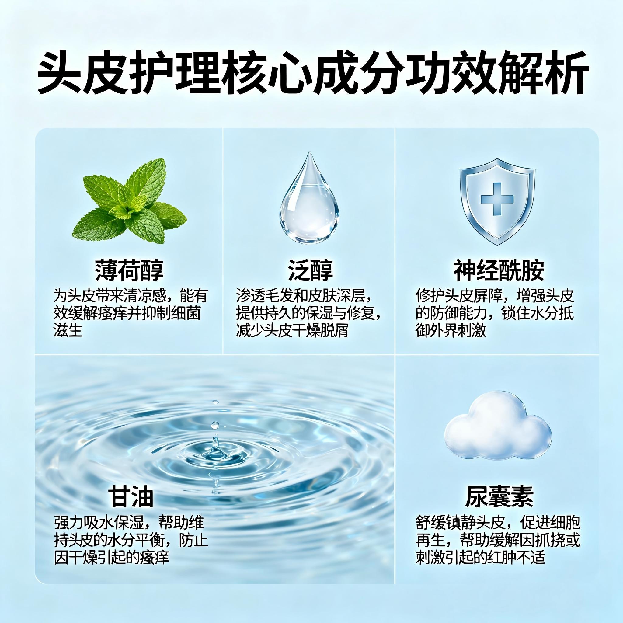 尿囊素、甘油维持头皮水润度,缓解去屑成分可能带来的干燥感