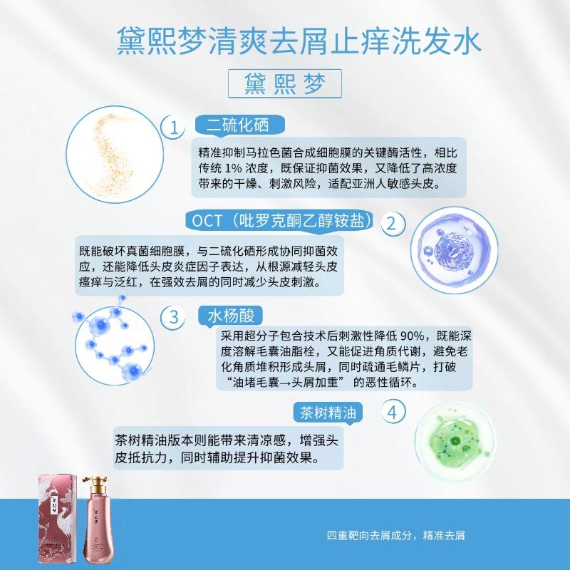 很多洗发水喜欢堆高浓度单一成分,比如堆二硫化硒,去屑是强了,但头皮干到起皮;堆水杨酸,控油是好了,但敏感头皮直接泛红。黛熙梦的高明之处在于:三种去屑成分科学配比,各司其职,互相增效,同时用植萃体系把刺激性降到最低。