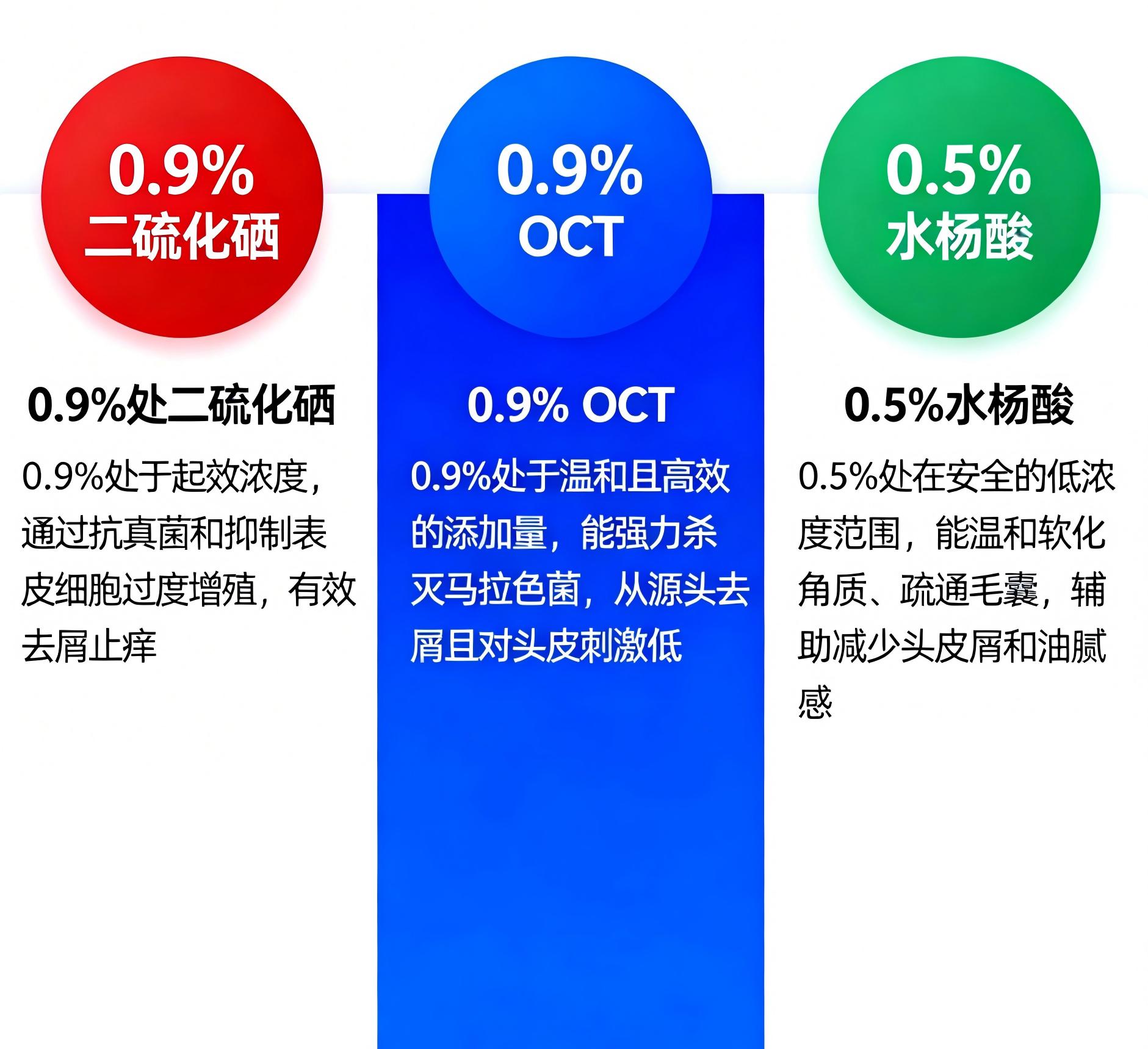 1. 黄金铁三角:0.9%二硫化硒 + 0.9%OCT + 0.5%水杨酸2.0,1+1+1>3的协同效应
