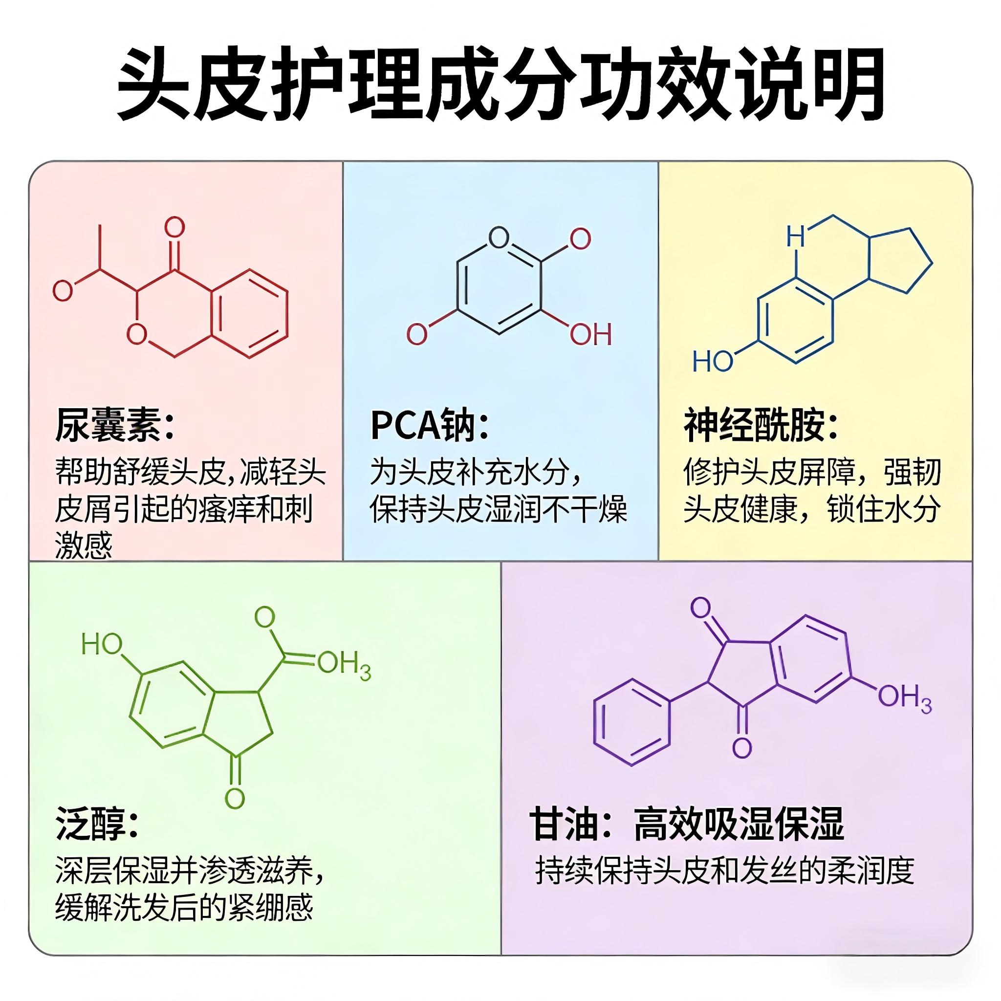 甘油作为基础保湿剂,通过吸收空气中的水分,维持头皮表面的即时水润,避免洗后紧绷。