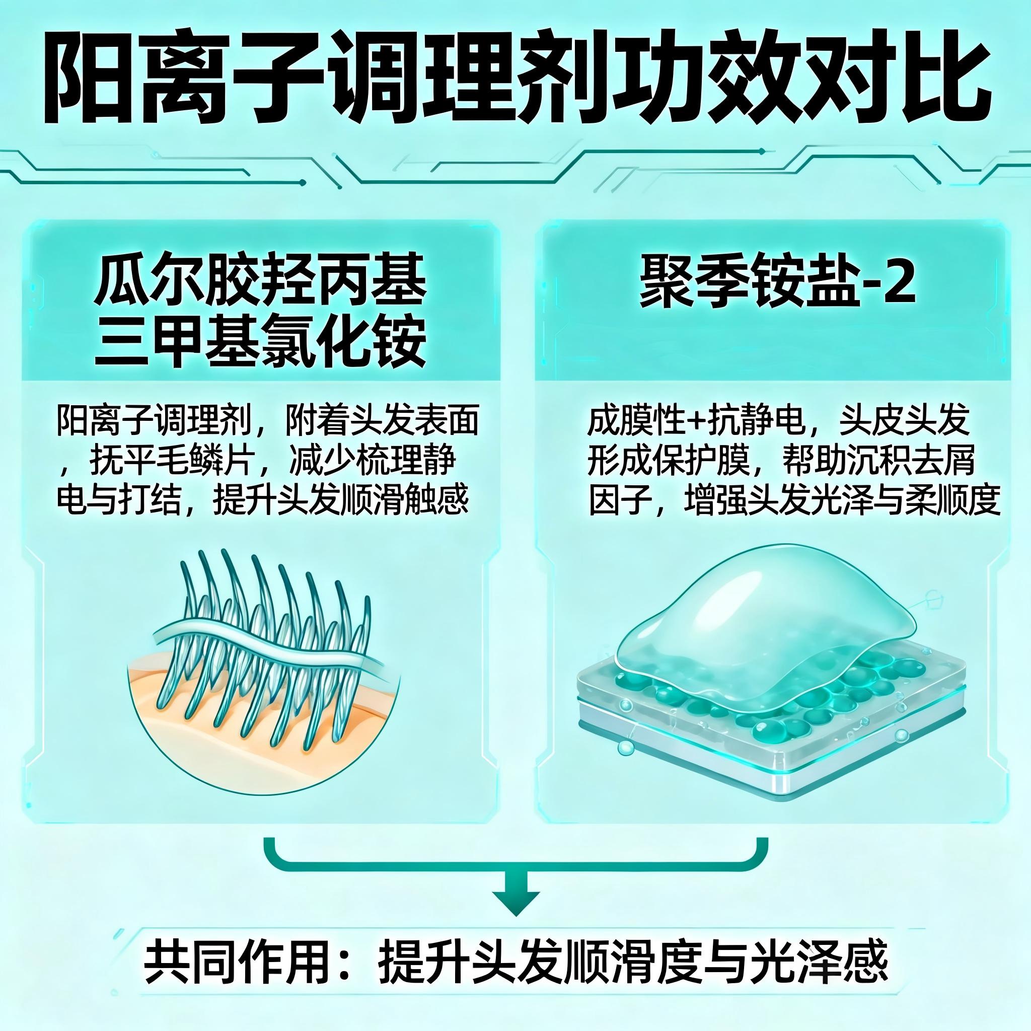 前者能吸附在发丝表面,形成保护膜,减少静电摩擦,提升顺滑度