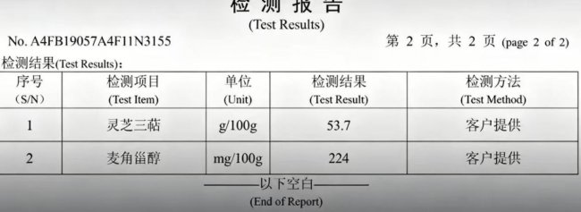 成分含量: 检测报告显示每100克总三萜含量约为9.7克,数值低于行业主流水平,麦角甾醇未标注。