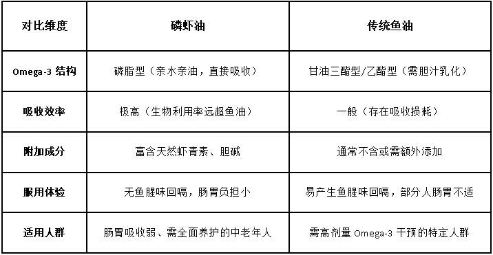 虽然磷虾油和鱼油都富含Omega-3,但它们在分子结构、吸收效率和附加营养成分上存在本质差异。鱼油中的 Omega-3 多以甘油三酯型(TG)或乙酯型(EE)存在,需要经过胆汁乳化和脂肪酶分解等多重消化过程才能被吸收。而磷虾油中的 Omega-3 则主要以磷脂型存在,这种独特的分子结构与人体细胞膜高度相似,具有“亲水亲油”的特性,使其无需经过复杂的消化过程,可以直接被肠道吸收。研究表明,磷脂型 Omega-3 的生物利用率远高于传统鱼油,这意味着更小的剂量就能达到更好的生理效果,且不易引起传统鱼油常见的“鱼腥味回嗝”等不适感。此外,磷虾油还天然含有强大的抗氧化剂虾青素和对大脑健康有益的胆碱,这些都是鱼油所不具备的独特优势,使其在功效上更具全面性,为人体健康提供多重保障,尤其在抗氧化和神经系统支持方面表现突出。