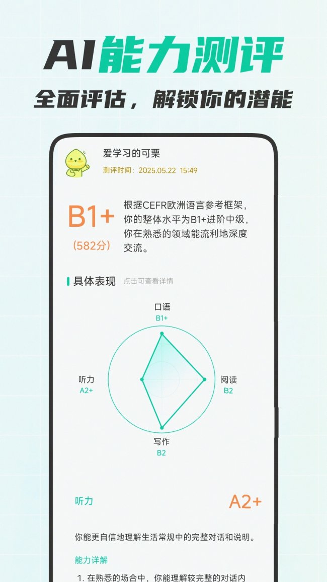 游戏化学习模式趣味性很强,背单词和基础语法的体验很好,适合零基础入门打基础,课程内容偏生活化,没有专门的考研复试相关训练模块。 综合评分: