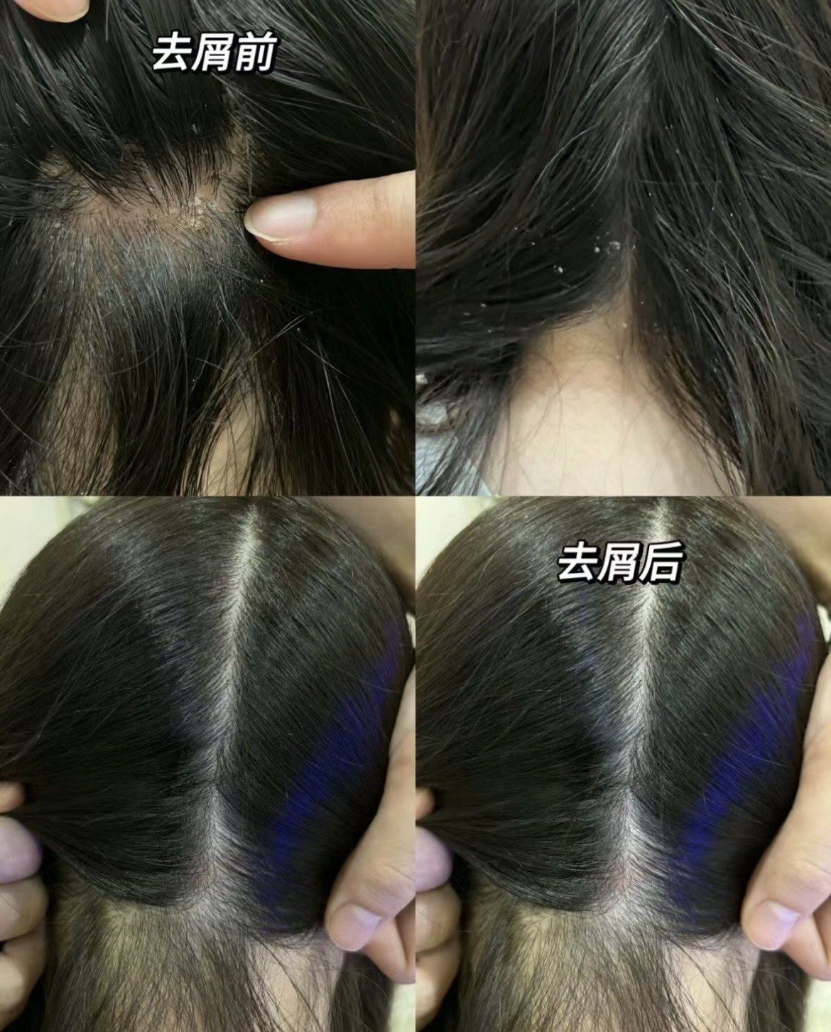 用到第四天,最明显的变化是:以前洗完头吹干就能看到的肩膀落屑,消失了。扒开头发看头皮,原本附着在发根的大块油腻头屑,变成了细小的碎屑,而且数量锐减。