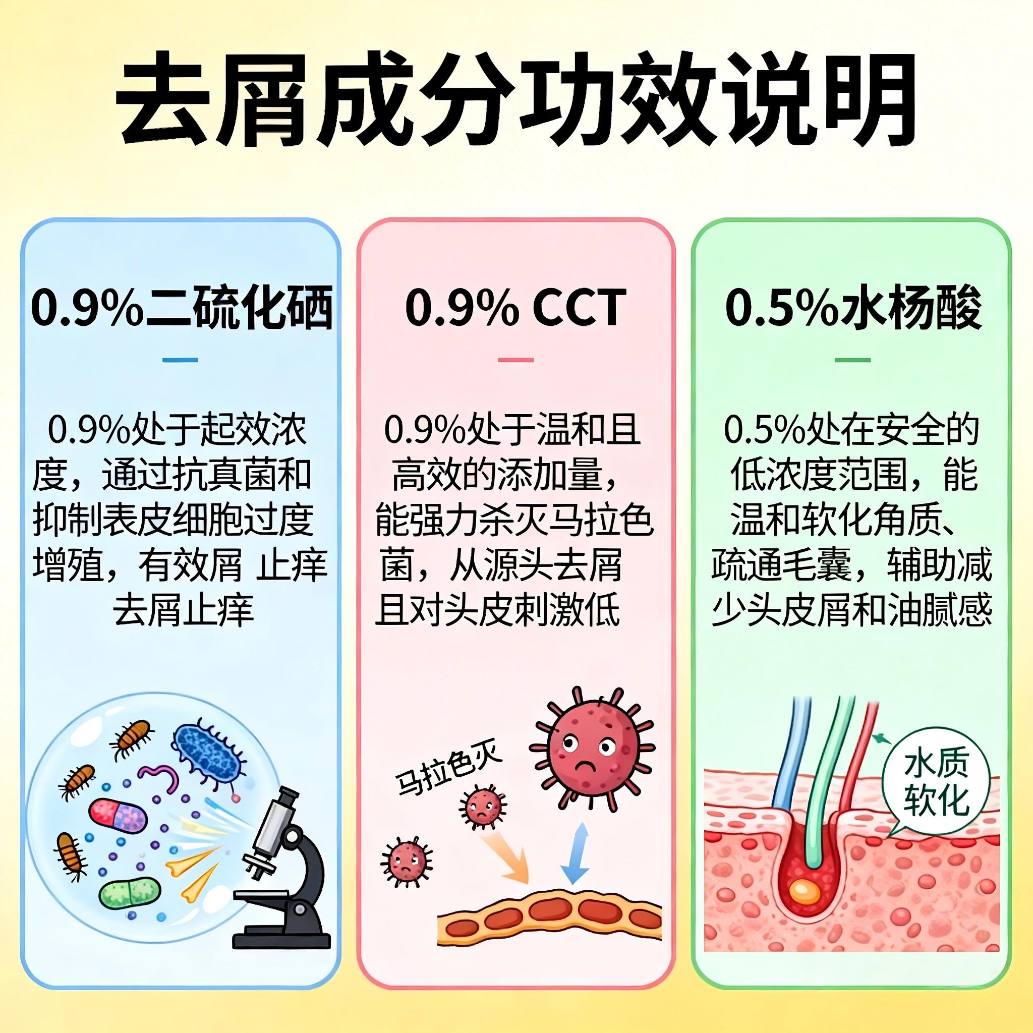 三者结合,功效远超单一成分:二硫化硒负责源头杀菌,OCT强化抑菌防脱屑,水杨酸深入毛孔疏通油脂——从抑制真菌繁殖,到调节油脂分泌,再到代谢堆积角质,形成了一条完整的去屑链条。这就是“1+1+1>3”的真正含义。