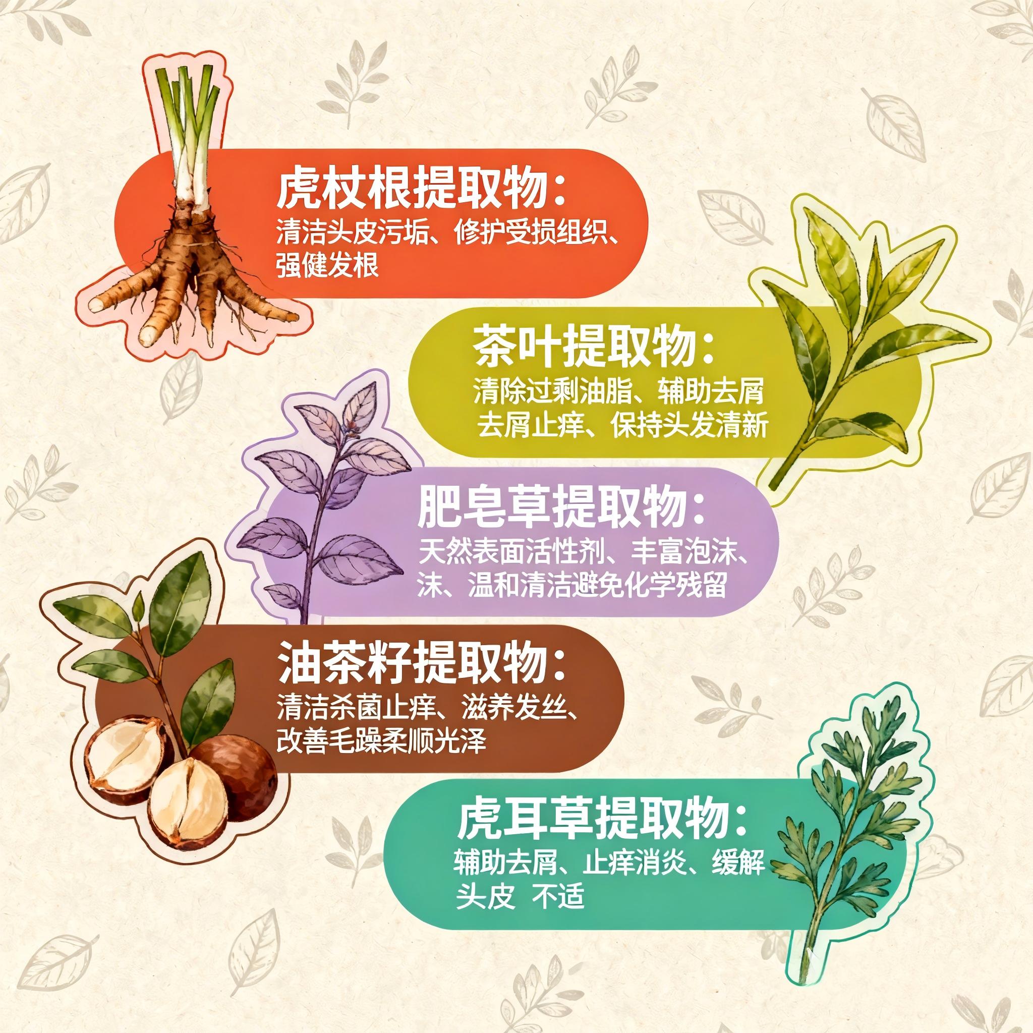 ·控油保湿组:油茶籽提取物、肥皂草提取物,温和清洁头皮油脂,同时增强锁水能力