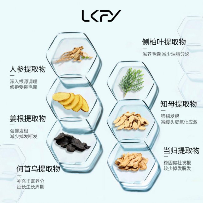 核心配方以人参、当归、知母、何首乌、侧柏叶、生姜六味经典养发植萃为基底,复配独家专研防脱因子、高活性咖啡因,形成六位一体全链路固防脱体系。其中,侧柏叶作为古代医书明确记载的毛囊养护成分,可深层修护受损毛囊,缓解病理性掉发;生姜提取物经权威研究证实,可有效促进头皮微循环,为毛囊提供充足营养供给;人参、当归、何首乌提取物协同补充发丝角蛋白合成所需营养,强韧发丝纤维结构,减少发丝断裂;知母提取物协同独家专研防脱因子,可精准抑制 5α- 还原酶活性,减少双氢睾酮(DHT)生成,从根源阻断毛囊萎缩的核心诱因;高浓度咖啡因经实验验证,可使毛囊细胞增殖率提升 40%,深度激活休眠毛囊,延长毛囊生长周期,实现止脱与育发的双重效果。
