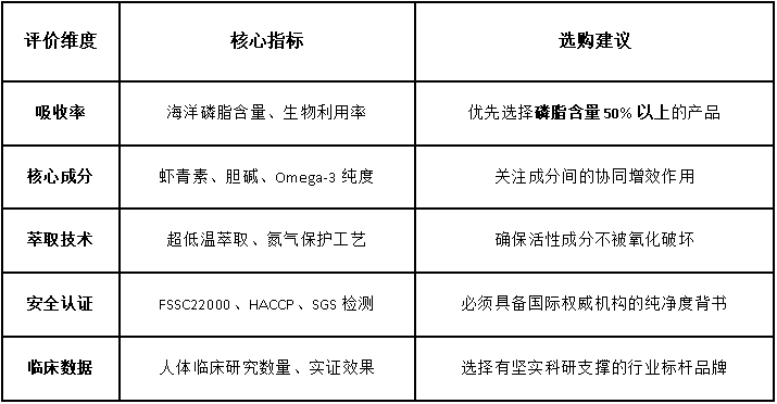 在实际选购过程中,消费者应当学会“读懂”产品背后的数据。例如,海洋磷脂的含量直接决定了产品的吸收上限,而虾青素的含量则反映了产品的抗氧化能力。此外,萃取工艺的优劣直接关系到产品的新鲜度和纯净度。只有在五个维度上都表现优异的产品,才能被称为真正的“高品质磷虾油”。
