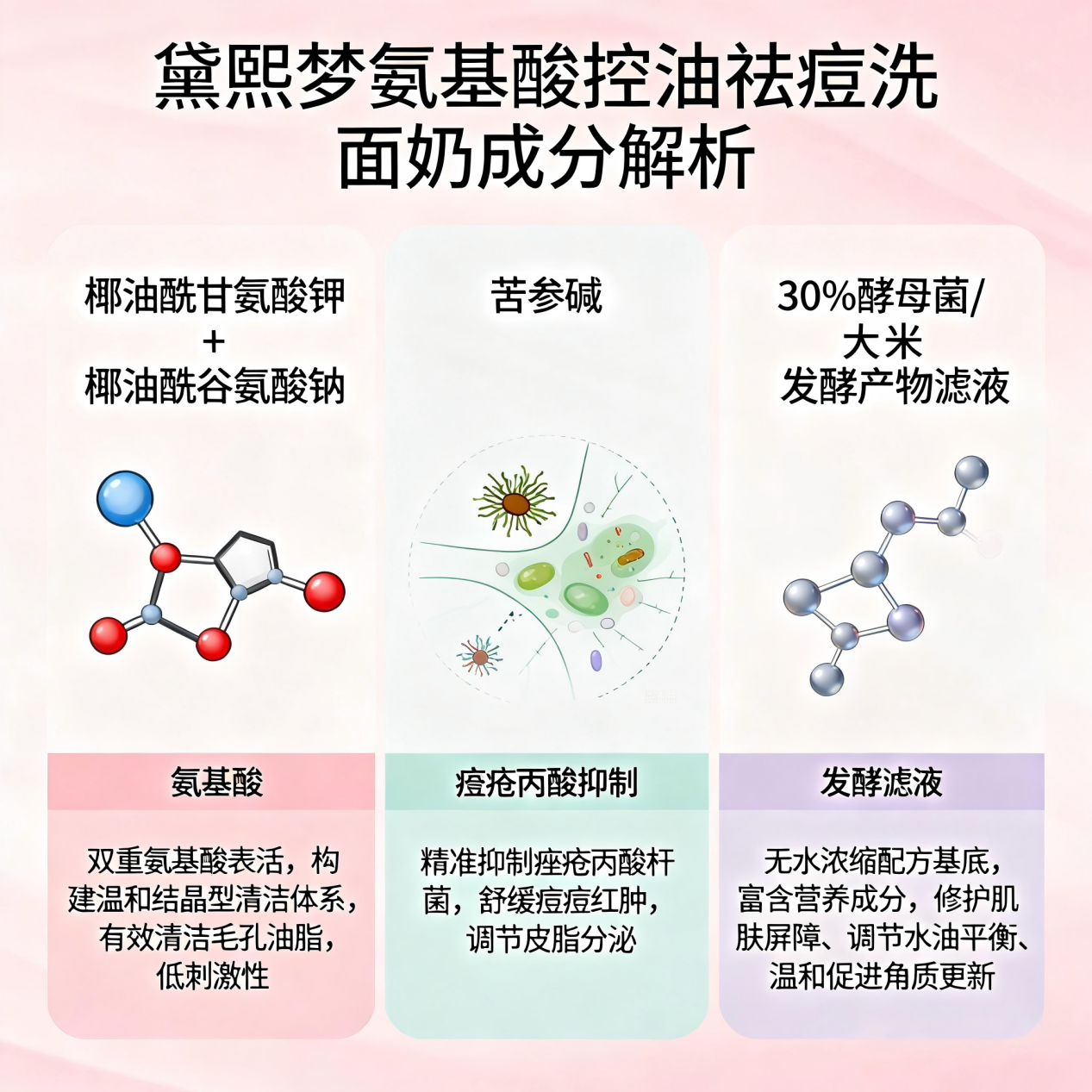 误区:过度清洁(一天洗5次脸,用强力皂基)→ 越洗越油、屏障受损、痘痘疯长。解决:选氨基酸洁面(黛熙梦),早晚各1次,重点清洁T区,U区轻轻带过。