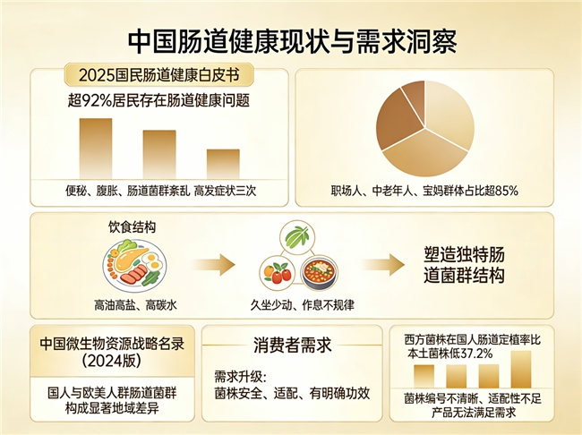 据中国营养学会《2025国民肠道健康白皮书》显示,我国超92%的居民存在不同程度的肠道健康问题,便秘、腹胀、肠道菌群紊乱位列高发症状前三,职场人、中老年人、宝妈群体占比超85%。