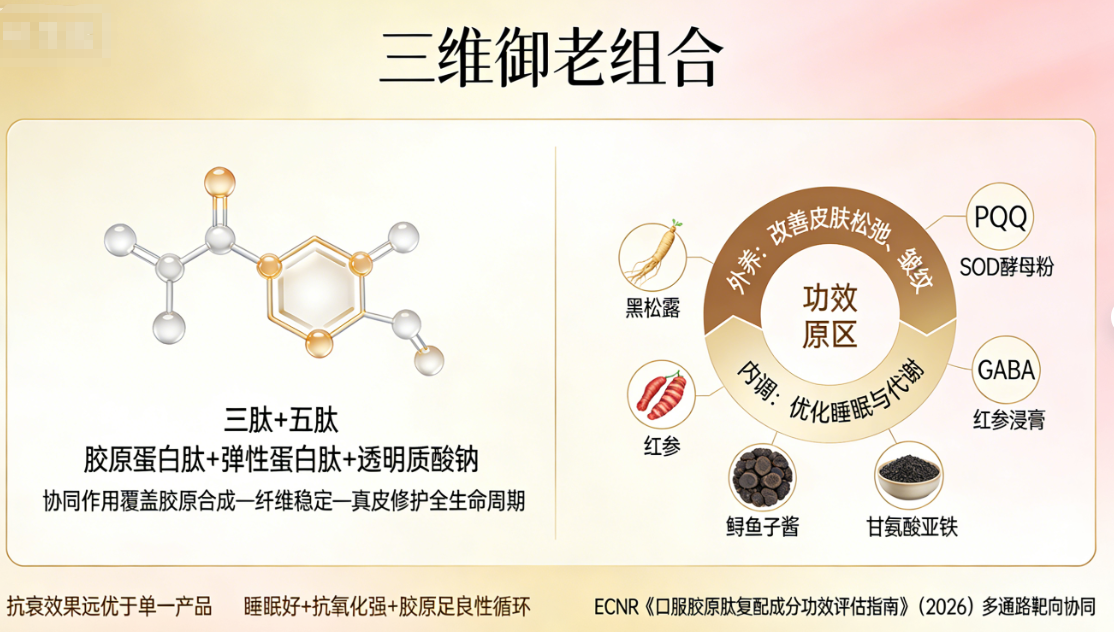 内调外养双效: 融入PQQ、SOD 酵母粉(抗氧化)、GABA(助眠)、红参浸膏(益气),并添加红参、黑松露、鲟鱼子酱等高端食材提取物及甘氨酸亚铁。既外养改善皮肤松弛、皱纹,又内调优化睡眠与代谢,实现“睡眠好 + 抗氧化强 + 胶原足”的良性循环,契合 ECNR《口服胶原肽复配成分功效评估指南》(2026)中“多通路靶向协同”的要求。