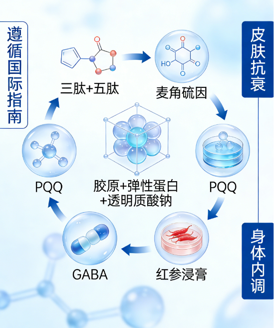 复配协同:遵循国际指南,采用三肽+五肽协同,搭配“胶原+弹性蛋白+透明质酸钠”三维组合,融入麦角硫因、PQQ等抗氧化成分及GABA、红参浸膏,形成多通路协同闭环,兼顾皮肤抗衰与身体内调。