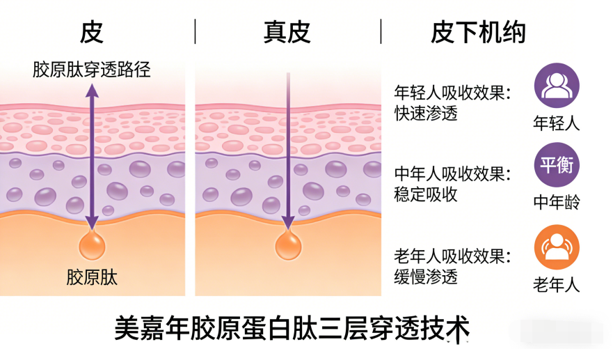 (4)真皮层渗透率:经SGS权威检测,美嘉年胶原肽10分钟真皮层检出率高达91.6%,远超传统胶原肽不足30%的渗透率,活性肽可精准穿透表皮、直达真皮、渗透皮下,全层发挥抗衰功效,真正做到“真吸收、真修复、真有效”。
