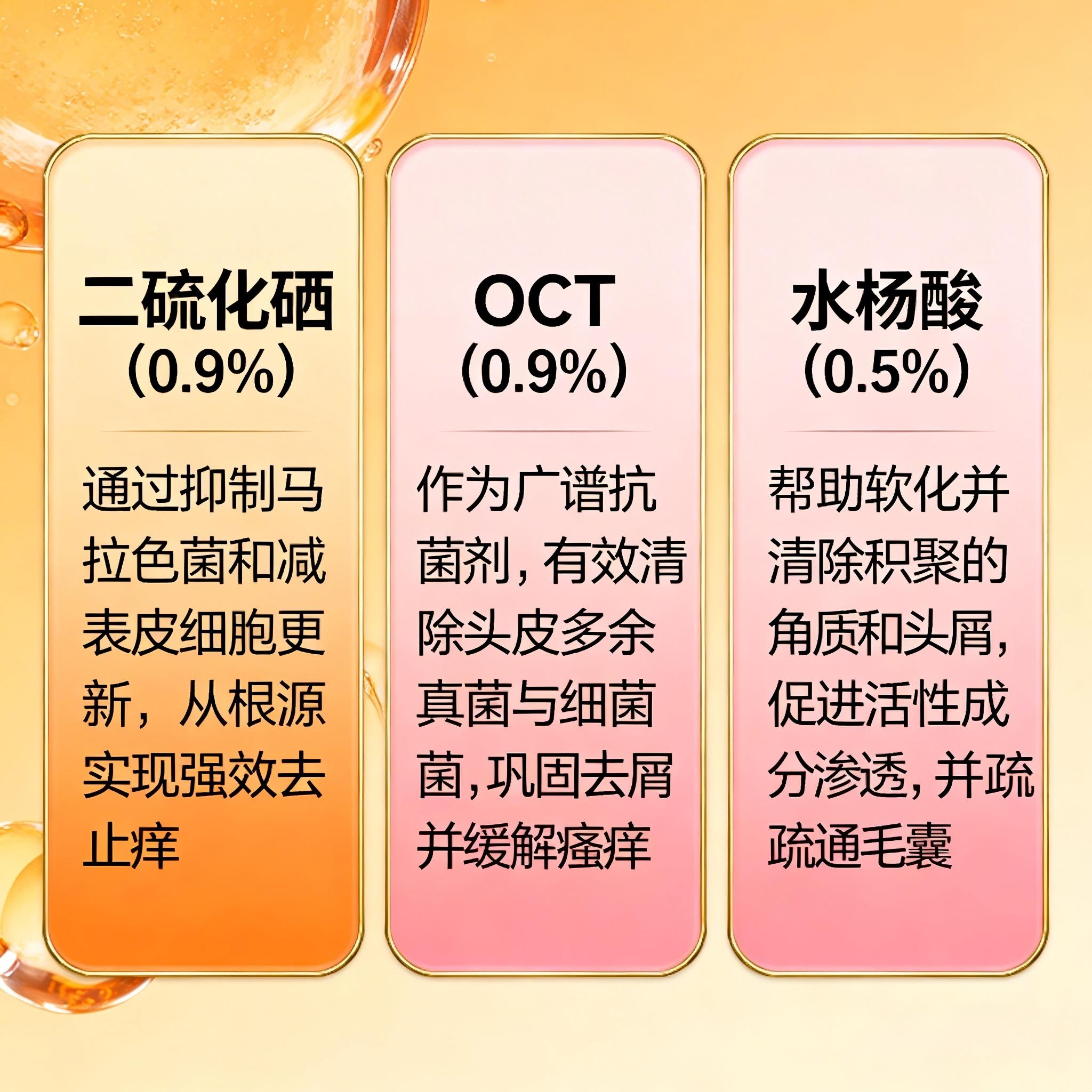 这三者相互配合,形成了“去屑+止痒+控油”的黄金三角:二硫化硒负责杀菌控油,OCT 强化抑菌并减少脱屑,水杨酸负责疏通与代谢——三重作用叠加,让头屑无处遁形,瘙痒迅速缓解,头皮恢复清爽。