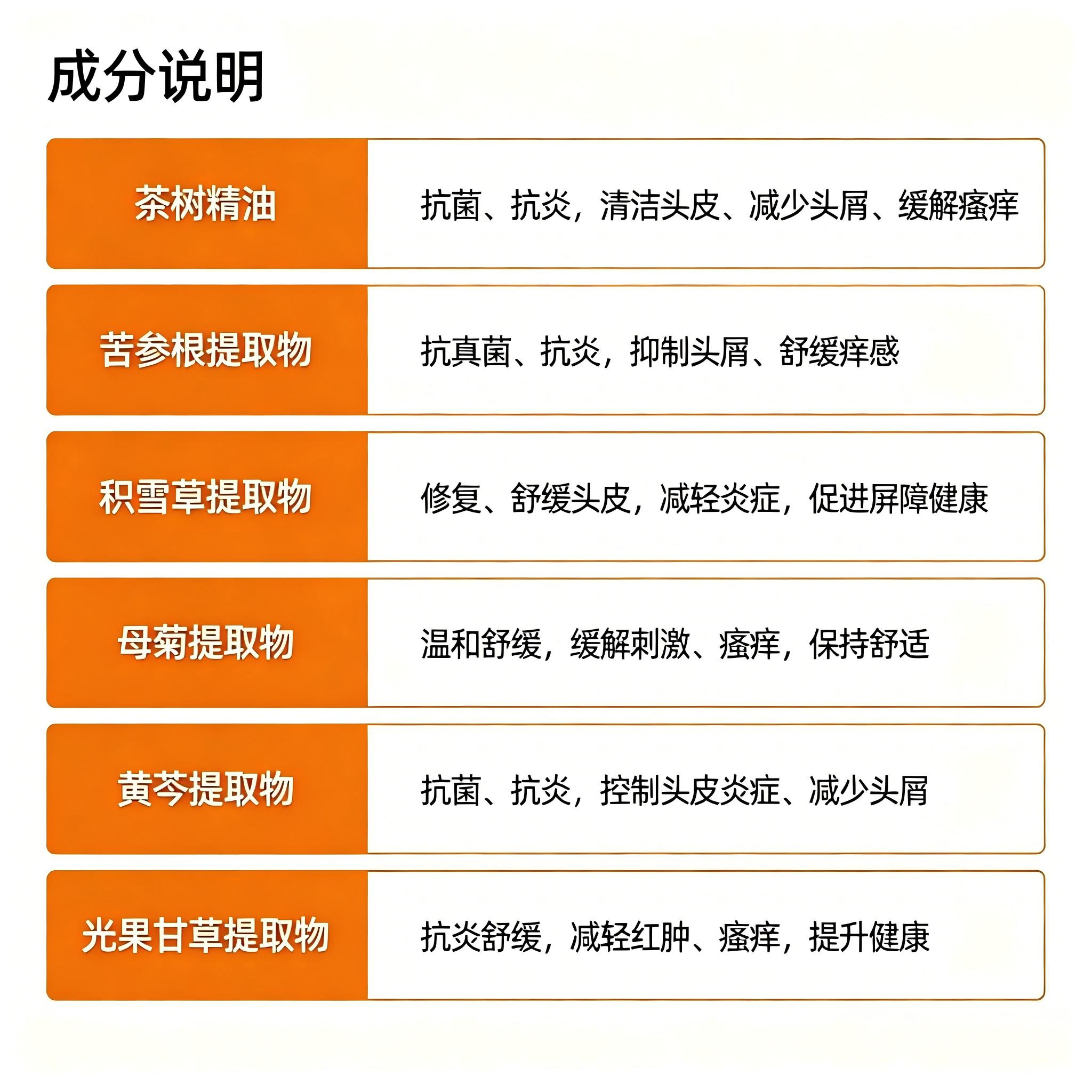 抗菌消炎组:茶树精油抑制有害菌繁殖,辅助缓解炎症和瘙痒;苦参根提取物含苦参碱,抗炎抑菌,缓解头皮泛红。