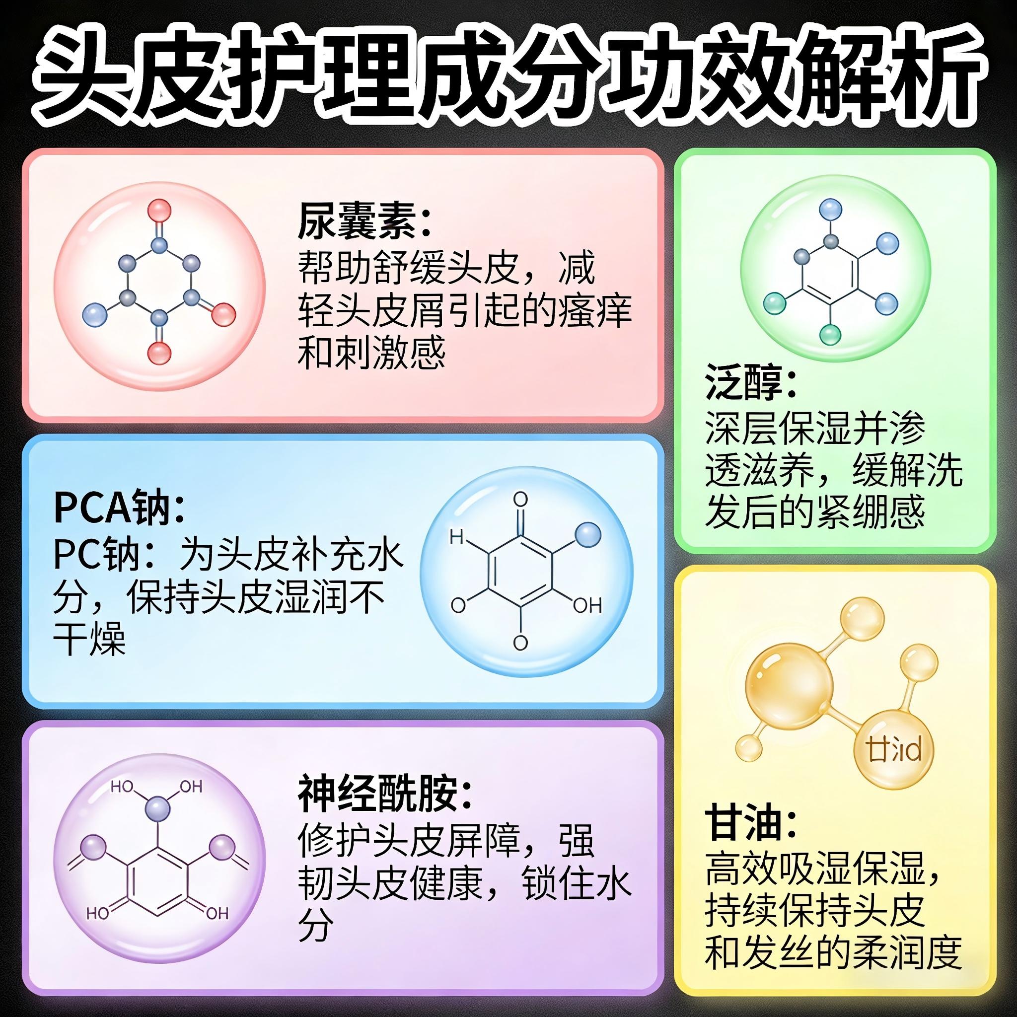 这五大成分相互配合,形成 “保湿+修护+舒缓”的立体屏障,确保去屑过程温和不刺激,头皮越洗越健康。