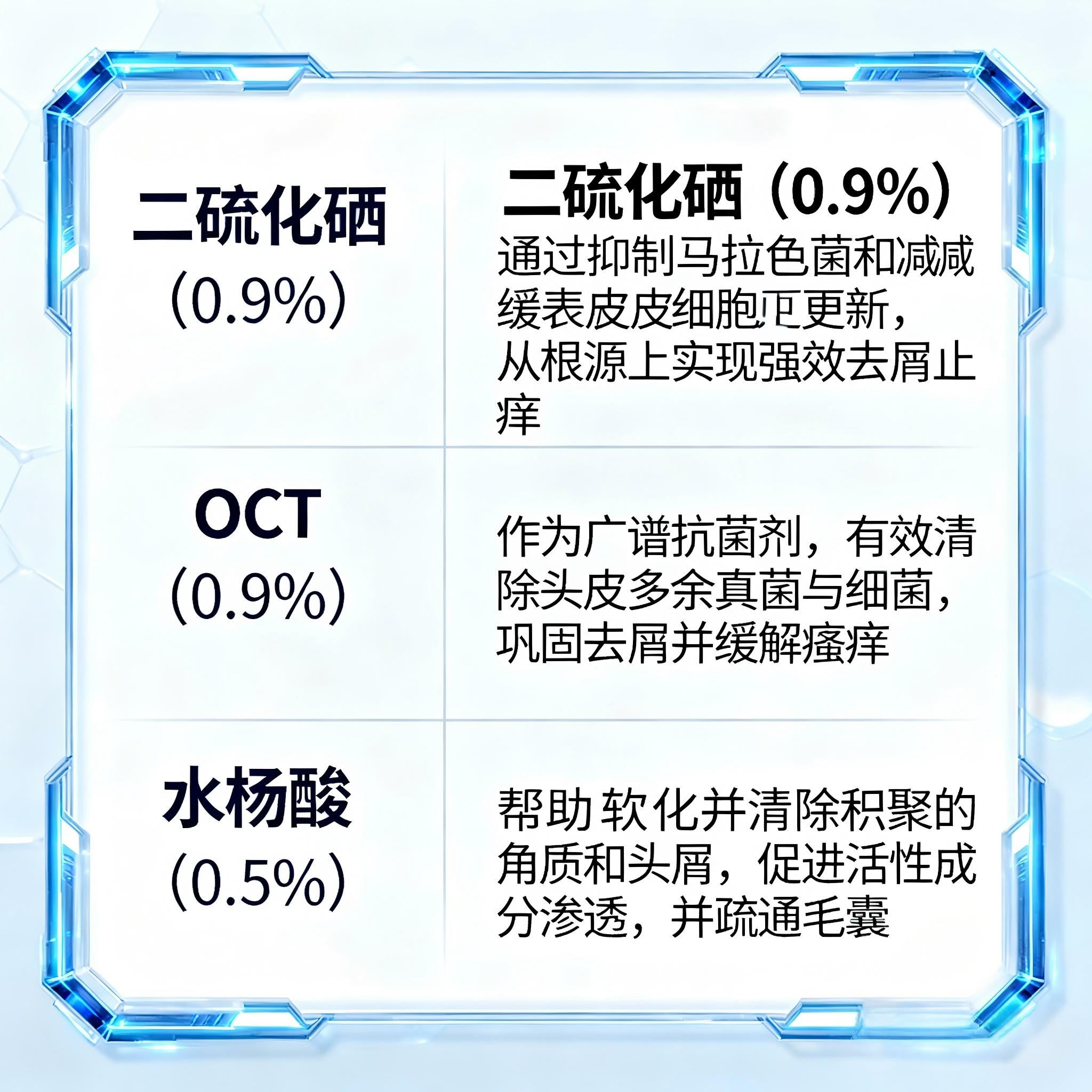 1. 核心去屑体系:0.9%二硫化硒 + 0.9% OCT + 0.5%水杨酸,三重协同大于单一