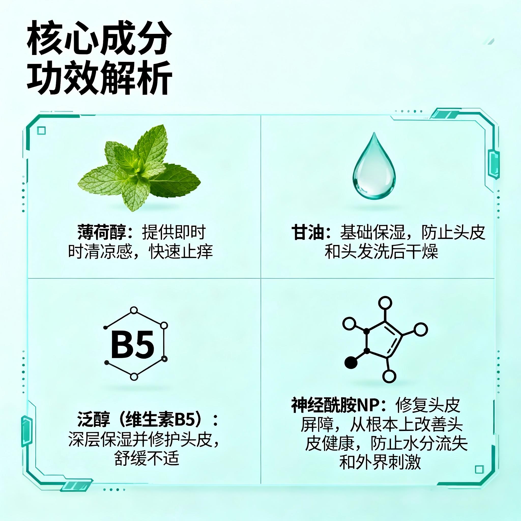 积雪草提取物能促进头皮胶原蛋白生成,修复受损组织,缓解红肿刺痛。母菊提取物(洋甘菊)富含黄酮类成分,抗炎舒缓作用强大。虎耳草提取物清热抗炎,缓解头皮泛红灼热感。这三味成分负责“安抚”,让已经受刺激的头皮冷静下来。