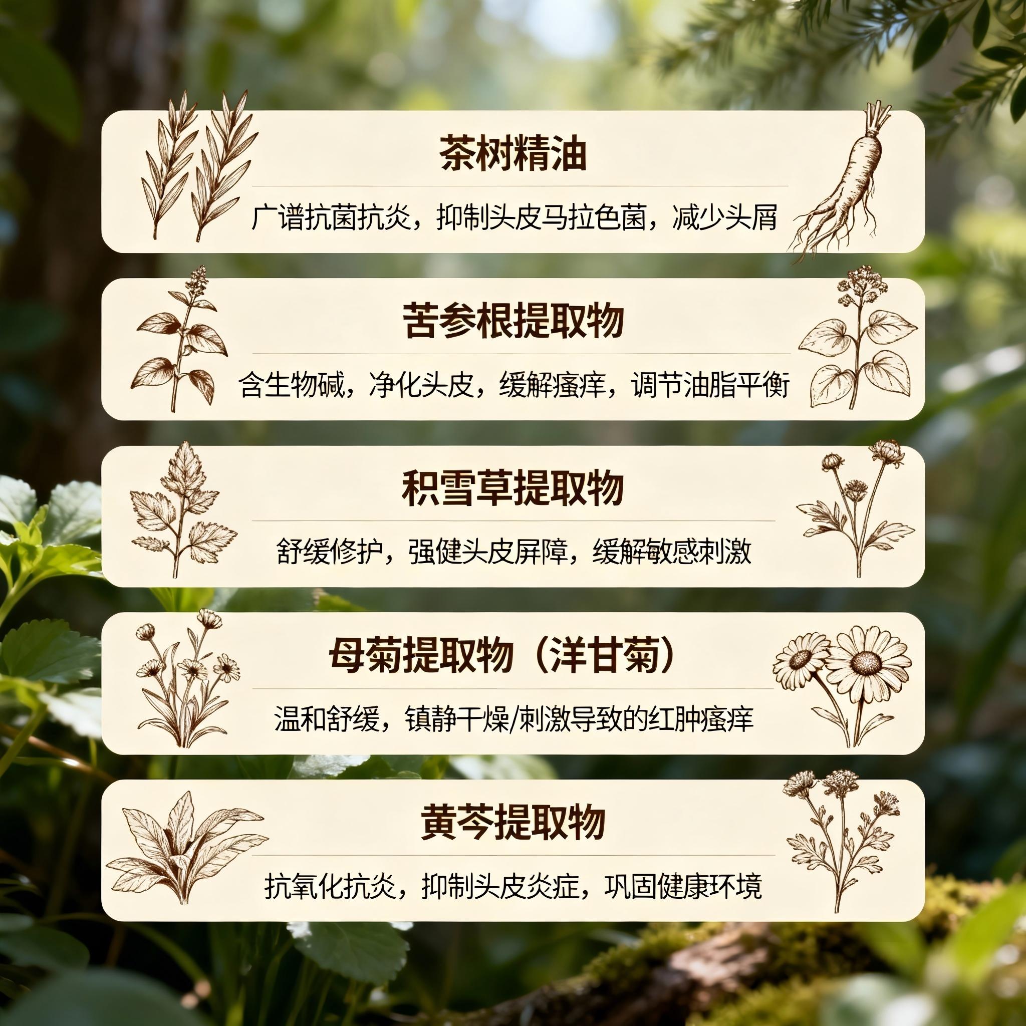 茶树精油是天然抗菌成分,能抑制头皮有害菌繁殖,辅助缓解炎症和瘙痒,同时调节油脂分泌,改善油性头皮异味。苦参根提取物含苦参碱等活性成分,具有抗炎、抑菌功效,对脂溢性皮炎引发的不适有舒缓作用。这两味成分负责“平乱”。