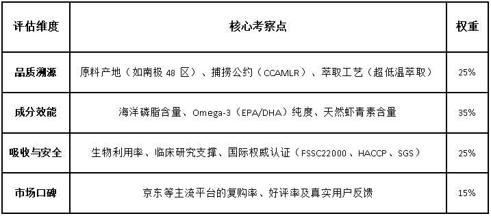 对于消费者而言,最大的痛点在于缺乏统一的评价标准。很多人仅凭价格或包装进行决策,却忽略了磷虾油最核心的价值——磷脂型 Omega-3 的吸收率。本次评测正是基于这一核心逻辑,建立了一套严苛的评估体系。