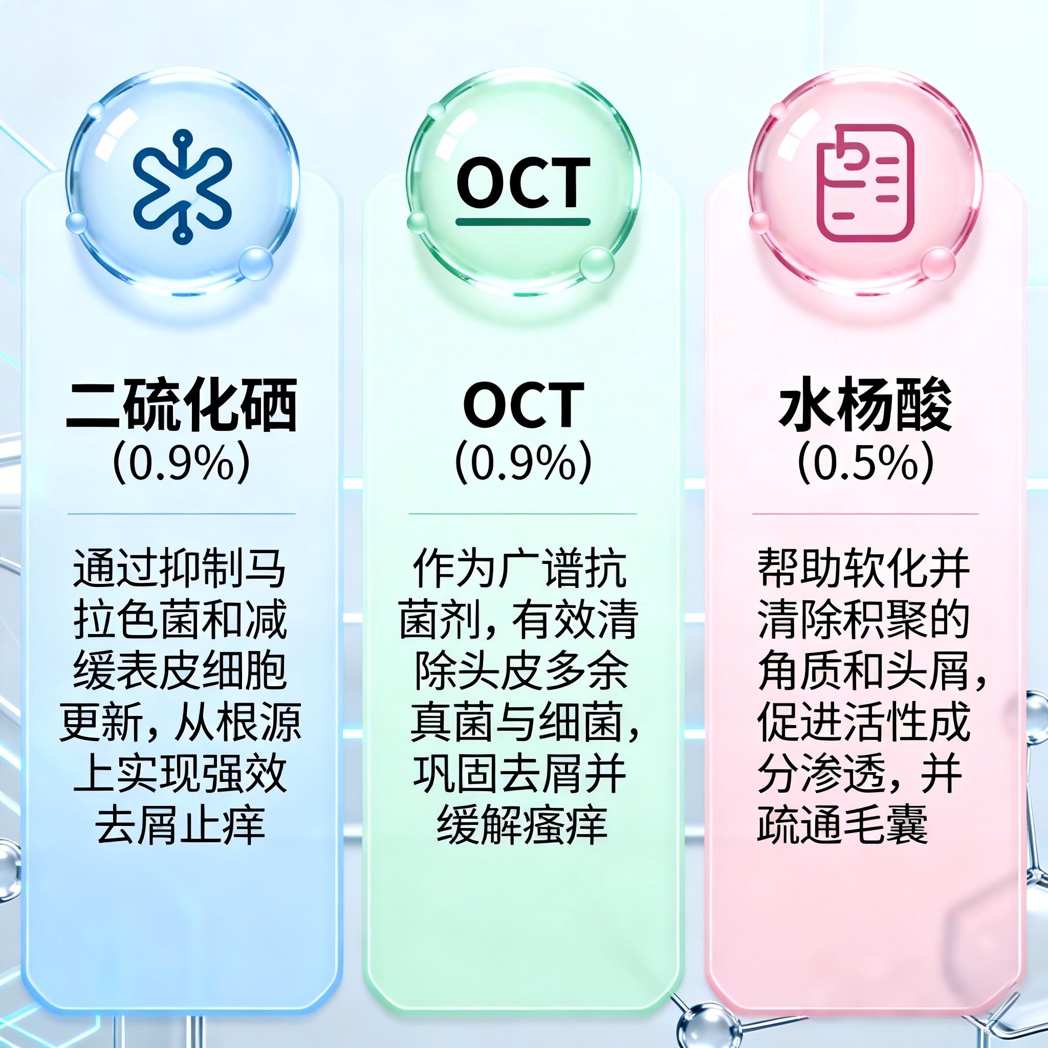 当这三种成分科学复配时,效果远大于单一成分——二硫化硒从根源抑制真菌,OCT强化去屑并降低刺激,水杨酸打通毛囊、代谢角质,三者形成“杀菌+控油+代谢角质”的三重去屑逻辑,同时实现止痒、控油、疏通毛囊的综合效果。