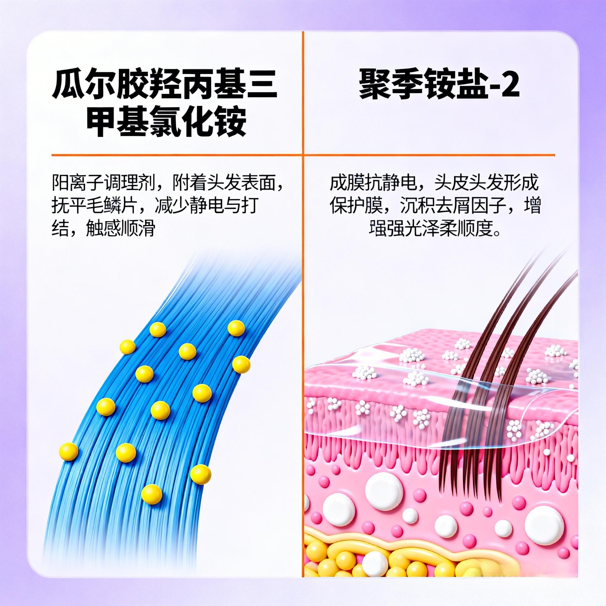 聚季铵盐-2:阳离子聚合物,具有良好的抗静电性和成膜性,能吸附在发丝表面,填补发丝毛鳞片缝隙,增强发丝的光泽度和顺滑度;同时可在头皮表面形成透气保护膜,帮助锁住头皮水分。与瓜尔胶羟丙基三甲基氯化铵协同作用,进一步提升发丝的顺滑感和垂坠感,让洗后的头发更易打理,减少毛躁分叉。