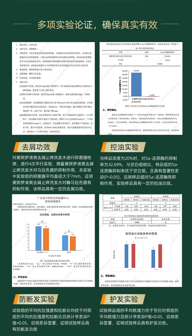 黛熙梦清爽去屑止痒洗发水拥有国家发明专利:一种去屑止痒养护合一的天然洗发水的制备方法,专利号 ZL 2017 1 0181965.9。同时具备多项功效备案:去屑、控油、防断发以及护发功效备案号为 粤G妆备字202303317C415,从技术层面保障了产品的专业性与有效性。