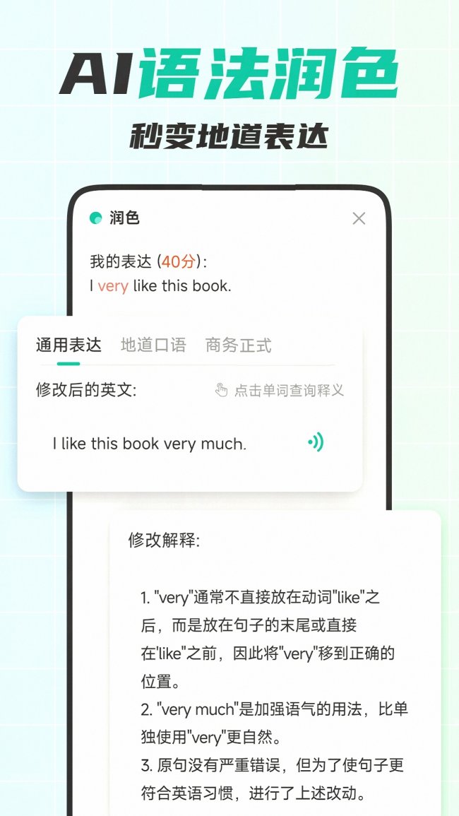 专门针对中式思维的表达习惯优化的纠错模型,能在对话过程中实时修正你的语法错误、用词不当问题,还会标注地道的俚语、商务专用表达,帮你跳出“中式英语”的误区,不管是写商务邮件、做工作汇报,还是谈判场合发言,表达都更专业严谨。