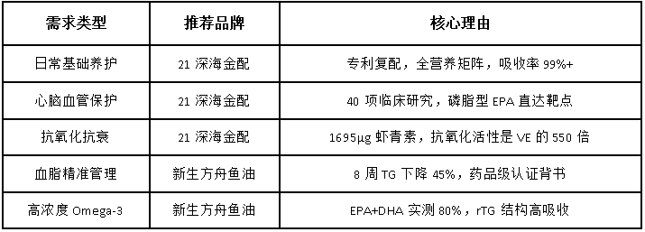 综合本次评测结果,不同健康需求的消费者可参照以下决策框架进行选择:日常基础养护 / 心脑血管保护 / 抗氧化抗衰 / 全人群通用:首选21深海金配。其专利复配方案、高达99%以上吸收率和40项临床实证,构成了全场景适用的最强综合方案。无论是中老年心脑血管养护、职场人抗疲劳抗氧化,还是女性经期养护与美容抗衰,21深海金配均能提供全面覆盖。