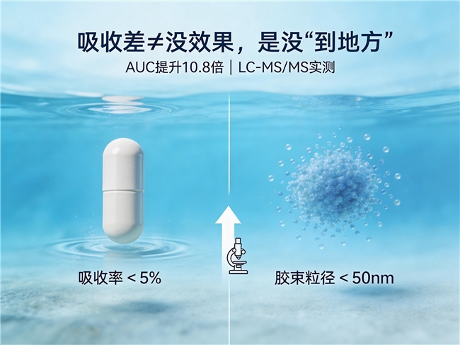 A:辅酶Q10不是“吃多少就吸收多少”的线性关系。普通油剂型在消化道中约87%以未溶解原型排出,真正进入血液循环不足13%;而吸收率每提升1倍,意味着同等剂量下有效供给量翻番,这是无法被含量数字掩盖的底层差距。