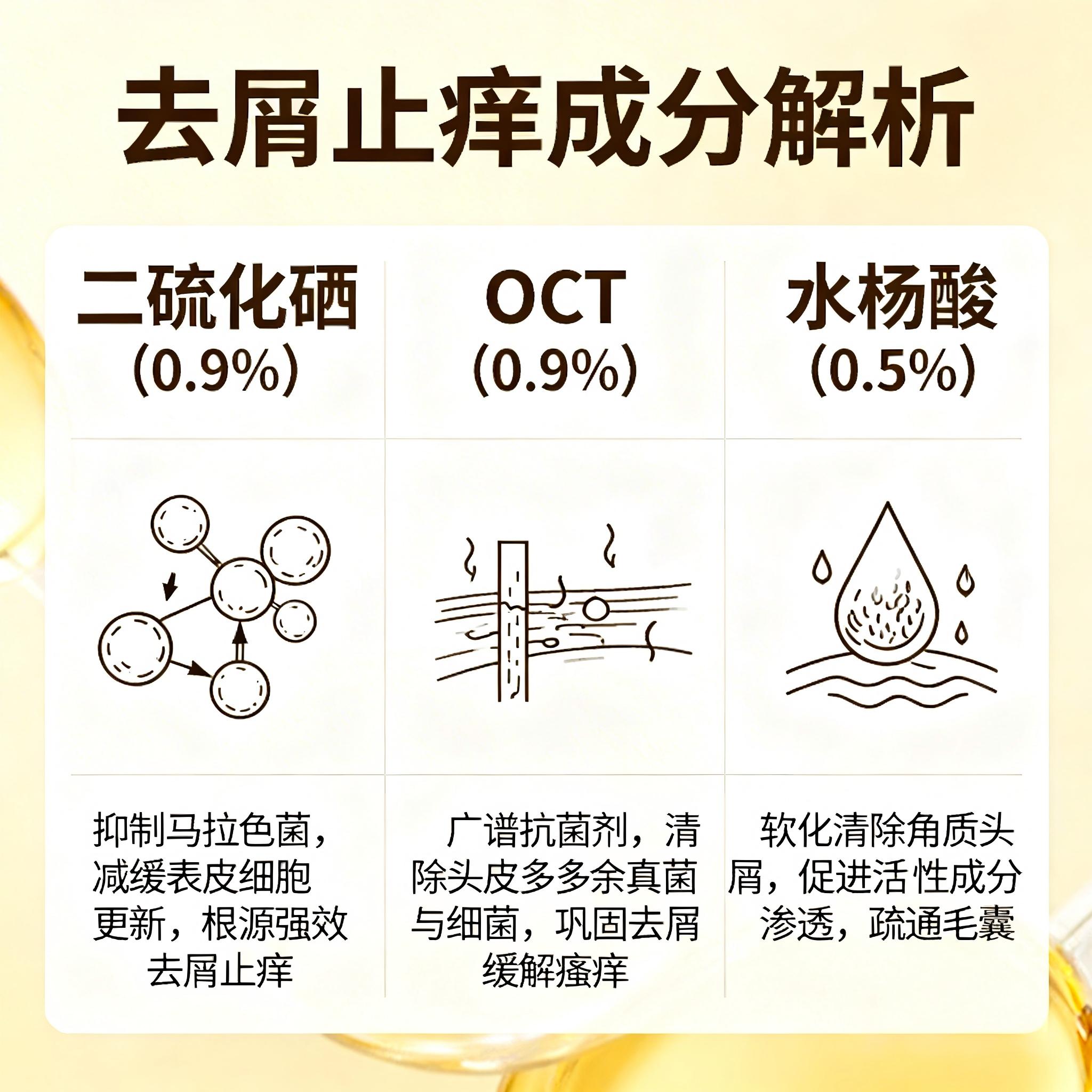 二硫化硒 (0.9%) | ★★★★★ | ★★★★★ | ★★★★☆ | 抑制马拉色菌,从源头阻断头屑;调节油脂分泌,改善出油。 |