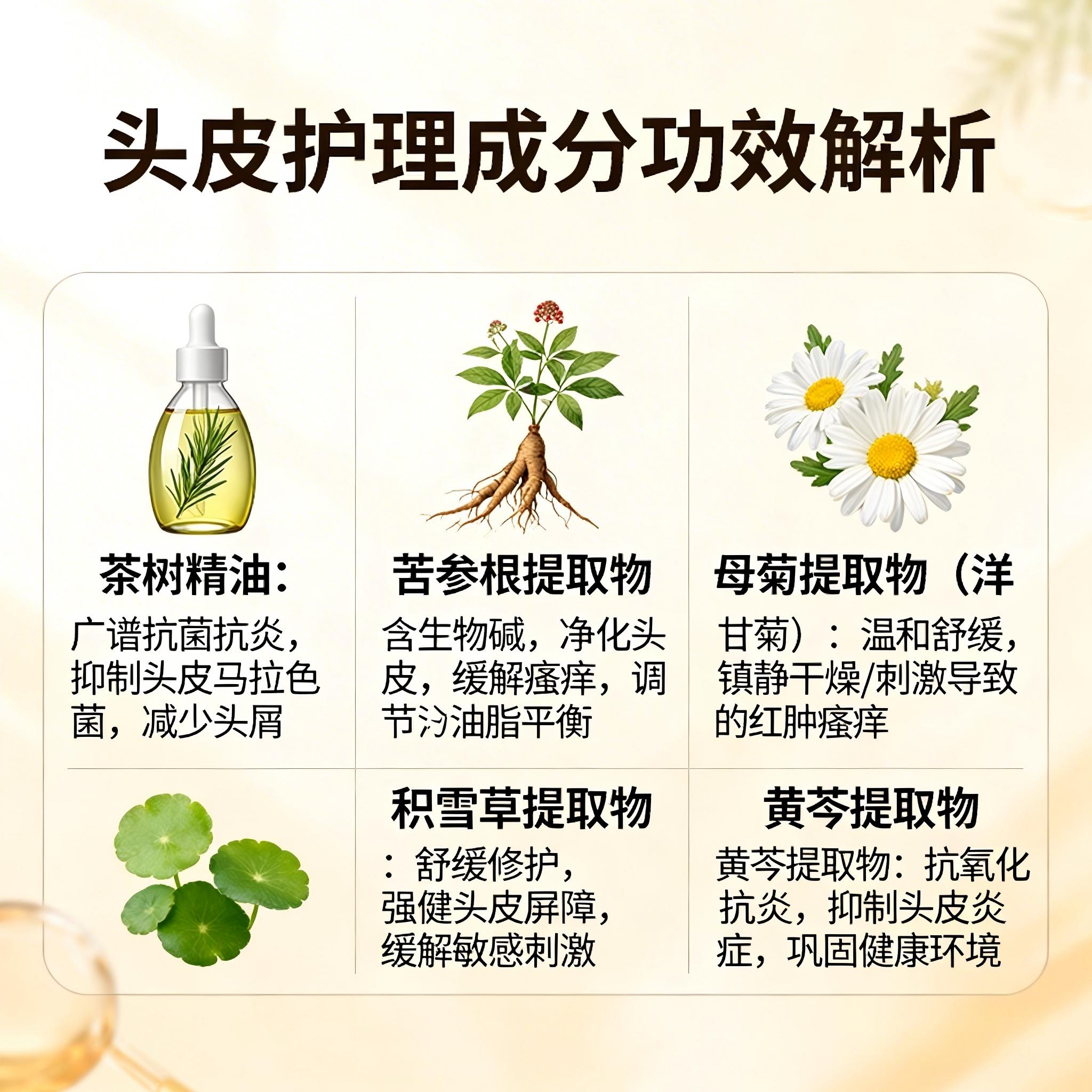 ·抗菌消炎组(茶树精油、苦参根提取物):辅助抑制有害菌,缓解炎症与瘙痒,调节油脂,改善头皮异味。