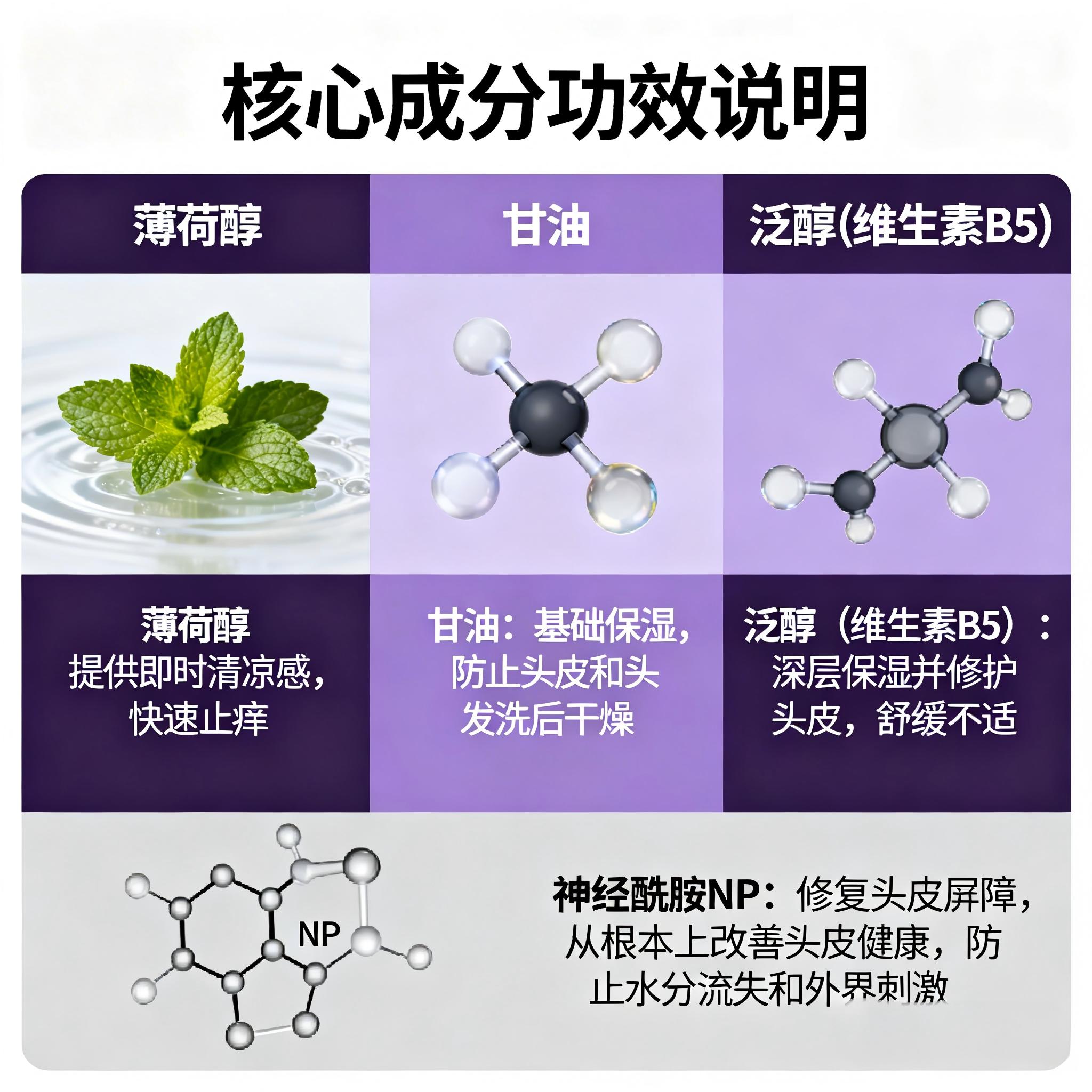 薄荷醇:带来即时的清凉感,快速缓解头痒,提升清爽体验,尤其适合夏季或油腻头皮使用。