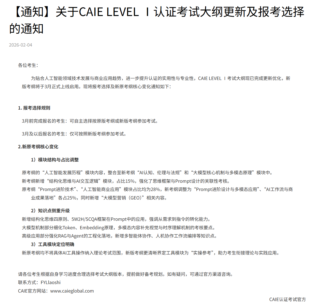2026 年2 月 4 日,CAIE (赛一)注册人工智能工程师认证官方发布重要通知,CAIE LEVEL Ⅰ 考试大纲完成全面更新优化,新版考纲将于 3 月份正式上线启用。此次考纲升级紧扣人工智能领域技术发展与商业应用趋势,实现从 “技术认知” 向 “成果导向” 的核心转变,进一步强化认证的实用性与专业性,同时官方设置报考窗口期,为考生提供灵活的备考选择。作为国内 AI 应用领域的标杆认证,CAIE LEVEL Ⅰ 是企业 AI 基础岗招聘的 “初筛绿色通道”,其考纲升级也将为行业培养更贴合实际需求的复合型 AI 应用人才。