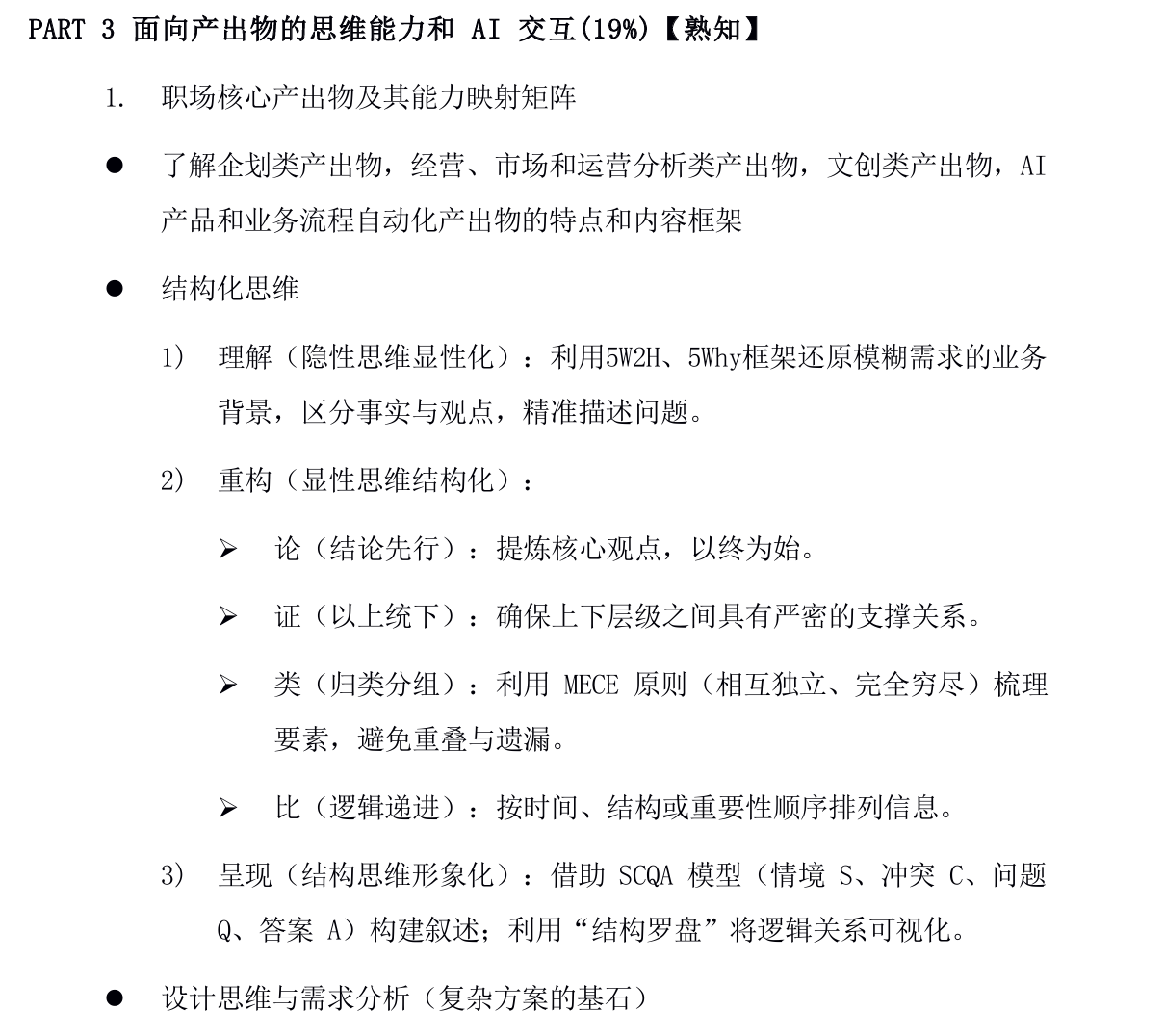 在模块结构与占比方面,新版考纲实现了内容的科学整合与重点强化。原考纲 “人工智能发展历程” 模块内容被拆分整合至 “AI 认知、伦理与法规” 和 “大模型核心机制与多模态原理” 两大模块,让基础理论知识与应用场景更贴合;新增占比 15% 的 “结构化思维与 AI 交互逻辑” 模块,首次将思维框架与 Prompt 设计的关联性纳入核心考核,填补了从需求分析到 AI 指令转化的能力考核空白;同时调整核心应用模块占比,将原考纲分别占比 28% 的 “Prompt 进阶技术”“人工智能商业应用”,优化为 “Prompt 进阶设计与多模态应用”“AI 工作流与商业成果落地” 各占 25%,并新增 “大模型营销(GEO)” 相关内容,让商业应用考核更聚焦实际产出。