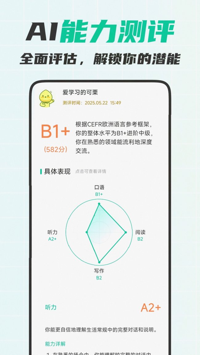 基于CEFR国际标准打造的智能测评系统,覆盖从A0入门到C2母语级的全水平层级,能精准定位你的英语水平,自动分析强弱项,实时更新水平能力分,学习进度和能力成长数据都有可视化展示,每一点进步都看得见。系统还会根据你的薄弱点定制专属学习路径,只练你真正需要的内容,避免做无用功。 目前可栗口语已经在全球积累了2.9亿+用户,99.2%的用户给出了5星好评,苹果应用商店常年保持4.9分,华为应用市场评分高达4.9分,有210万一线英语教师将其列为课堂辅助工具,包括华为、字节跳动、新东方等近百家知名企业都把它纳入了员工商务英语培训体系。 核心功能都提供免费试用次数,进阶会员的费用不足真人外教课的1/1200,年均学习成本仅需百元,算下来平均5分钟的学习效果就能抵得上一节线下外教课,性价比非常高。 还有游戏化的学习机制,整合了“商务情景闯关”“口语PK排行榜”“任务勋章体系”等元素,完成“商务谈判赢订单”“海外展会对接客户”等情景任务还能兑换实体英文原著,学习坚持率比传统APP提升了320%,98.3%的用户反馈“练商务口语再也不枯燥”。