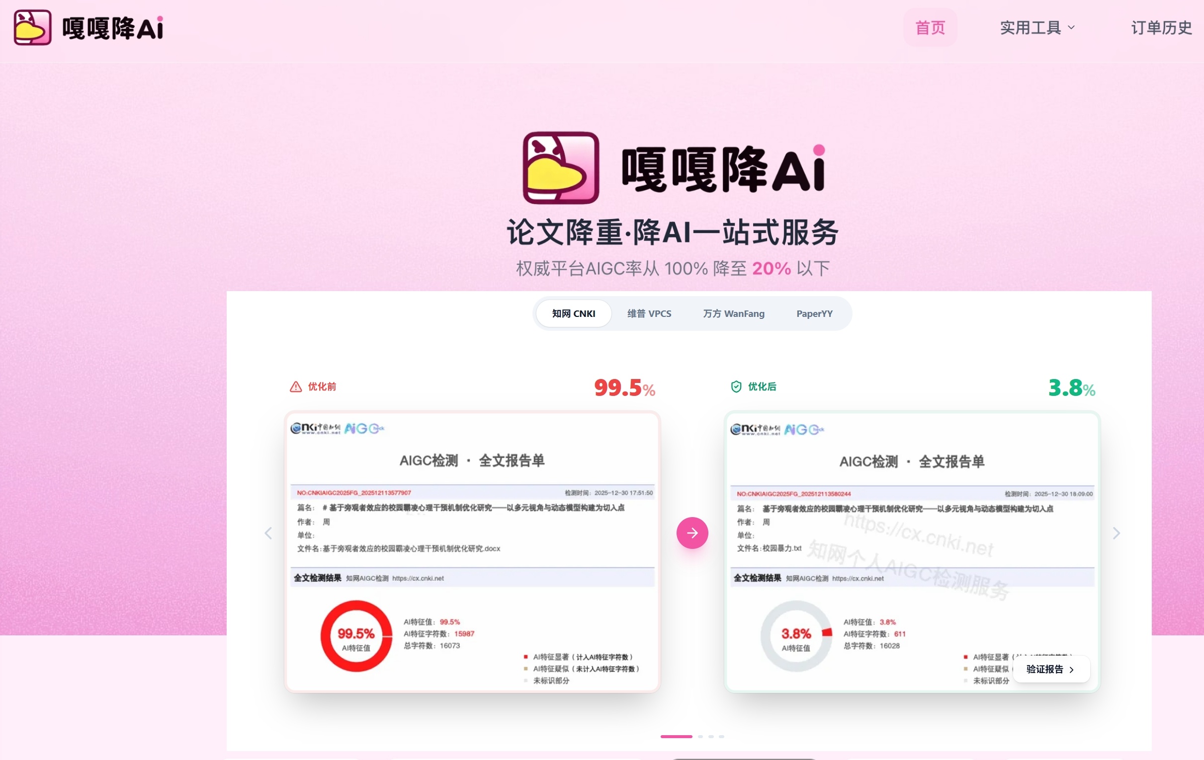 兼容各平台最新检测算法。 2026年各检测平台的AIGC算法都在升级,以前能用的方法现在可能失效了。嘎嘎降会跟着各平台的算法更新同步迭代,确保处理策略是最新的。你不用担心工具跟不上算法升级。