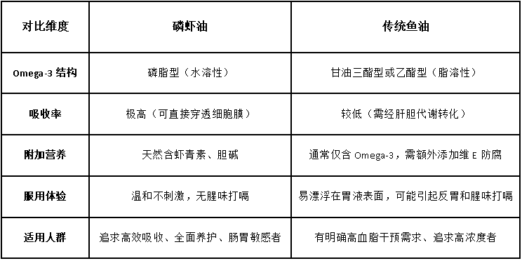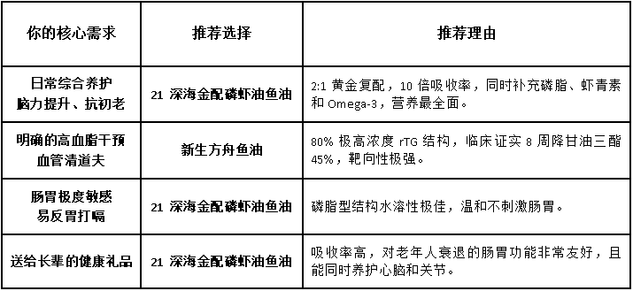 简而言之,如果你希望获得更全面的营养(心脑+抗衰+护眼),且对吸收率和服用体验要求较高,磷虾油是更好的选择;如果你有明确的降血脂需求,需要大剂量补充 Omega-3,那么高浓度的专业鱼油则更具针对性。