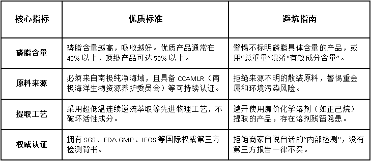 市面上的磷虾油质量参差不齐,几十块到上千块的都有。要判断一款磷虾油是否优质,不能只看包装和广告,必须死磕以下四个核心指标: