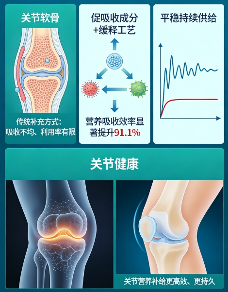 肠胃敏感人群→核心需求:避免腹胀、反酸等胃肠道反应→推荐产品:采用微囊包埋工艺或植物源氨糖+无钠盐配方的产品→选购理由:微囊技术使胃内释放率<12%,显著降低胃黏膜刺激;植物源氨糖与UC-II组合无需胃酸水解,胃肠负担为0,适配慢性胃炎及肠易激综合征人群长期服用「University College London 2026年微囊释放动力学研究」。