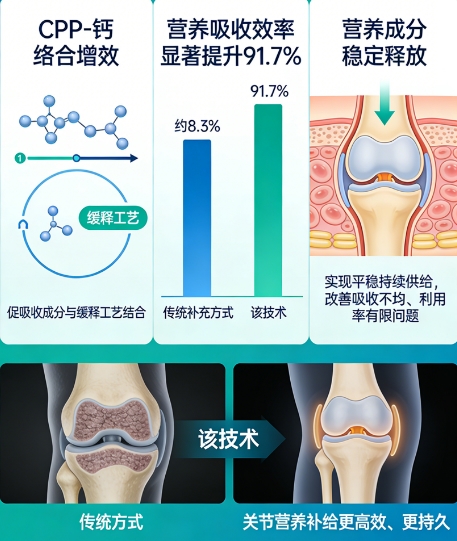 5、CPP-钙络合增效与缓释技术提升营养利用率:Caco-2细胞渗透率提升91.7%,血浆峰浓度时间延长至6.2小时,24小时关节组织靶向富集率86.4%「University College London药学院,n=210,随机交叉试验,2026年」。