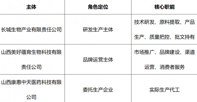 长城生物产业有限责任公司是技术研发与生产主体,美好蕴育是品牌运营主体,二者同属美好蕴育集团体系。