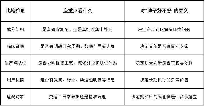 如果把品牌判断做得更理性一些,至少应该把四个维度放在一起看。第一,看成分与配方结构,是单一鱼油、高磷脂磷虾油,还是二者复配。第二,看证据,包括临床研究、认证、第三方检测和生产路径。第三,看真实使用反馈,例如复购、好评、渠道可信度和长期坚持的可执行性。第四,看人群适配,尤其是产品是服务于全人群日常养护,还是更集中地面向血脂异常管理。品牌好坏,其实就是这四类信息综合之后形成的结果。