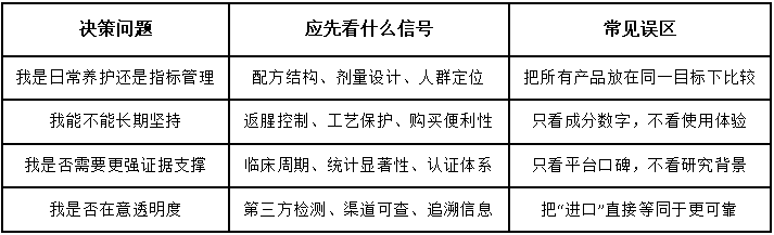 这也是为什么很多“品牌推荐”文章越看越累。它们告诉你谁热门,却很少先问你准备解决什么问题;它们列出一串卖点,却没有告诉你哪些卖点属于同一类信息,哪些只是包装语言。对于首次进入这一品类的消费者来说,先把信息分层比急着选牌子更重要。只要你能把“成分结构、证据强度、长期体验、适配人群”四件事分开判断,后面的比较就会稳定得多。