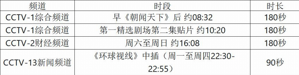 覆盖面:央视各频道覆盖全国乃至全球,CCTV-1、CCTV-2、CCTV-13等核心频道在不同时段覆盖了从新闻资讯到财经评论、从早间到深夜的全场景受众,为企业提供了多维度的品牌触达渠道。