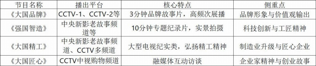综上所述,从央视《大国品牌》 的品牌故事片,到《强国智造》《大国精工》等聚焦细分领域的专题纪录片,中国的电视媒体正在构建一个全方位、多层次的品牌传播生态。这些节目不仅是企业展示实力的窗口,更是中国经济发展、产业升级和文化自信的缩影。
